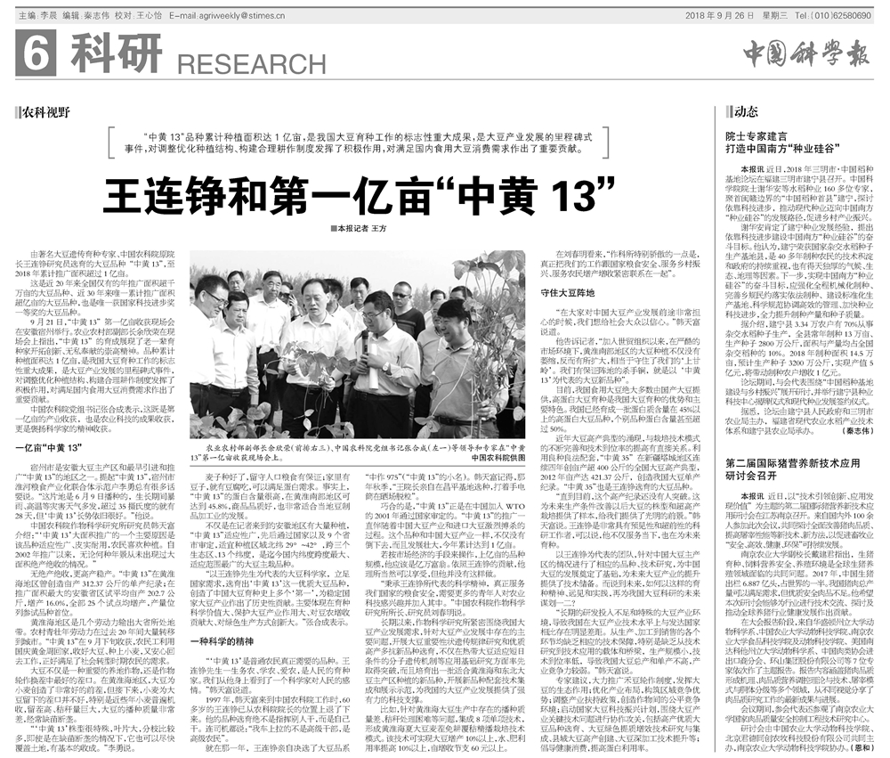 [中国科学报]王连铮和第一亿亩“中黄13”“中黄13”品种累计种植面积达1亿亩,是我国大豆育种工作的标志性重大成果,是大豆产业发展的里程碑式事件,对调整优化种植结构、构建合理耕作制度发挥了积极作用,对满足国内食用大豆消费需求作出了重要...2018.09.26