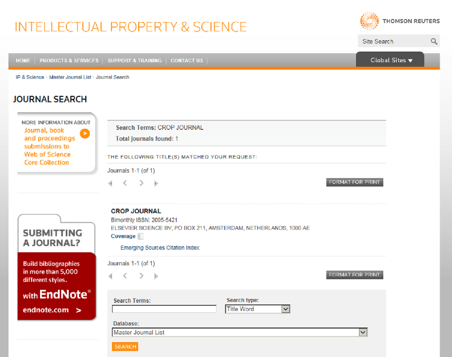 The Crop Journal被汤森路透的ESCI数据库收录The Crop Journal办刊取得重大进展,被汤森路透的Emerging Sources Citation Index(ESCI)数据库收录。汤森路透2015年11月发布的ESC...2015.12.07