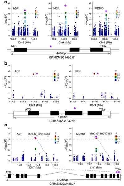 Background: Plant digestibility of silage maize (Zea mays L.) has a large influence on nutrition intake for animal feeding. Improving forage quality will enhance the utilization efficiency and feeding value of forage maize. Dissecting the genetic basis of forage quality will improve our understanding of the complex nature of cell wall biosynthesis and degradation, which is also helpful for breeding good quality silage maize. Results: Acid detergent fiber (ADF), neutral detergent fiber (NDF) and in vitro dry matter digestibility (IVDMD) of stalk were evaluated in a diverse maize population, which is comprised of 368 inbred lines and planted across seven environments. Using a mixed model accounting for population structure and polygenic background effects, a genome-wide association study was conducted to identify single nucleotide polymorphisms (SNPs) significantly associated with forage quality. Scanning 559,285 SNPs across the whole genome, 73, 41 and 82 SNPs were found to be associated with ADF, NDF, and IVDMD, respectively. Each significant SNP explained 4.2 % – 6.2 % of the phenotypic variation. Underlying these associated loci, 56 genes were proposed as candidate genes for forage quality. Conclusions: Of all the candidate genes proposed by GWAS, we only found a C3H gene (ZmC3H2) that is directly involved in cell wall component biosynthesis. The candidate genes found in this study are mainly involved in signal transduction, stress resistance, and transcriptional regulation of cell wall biosynthetic gene expression. Adding high digestibility maize into the association panel would be helpful for increasing genetic variability and identifying more genes associated with forage quality traits. Cloning and functional validation of these genes would be helpful for understanding the molecular mechanism of the fiber content and digestibility. These findings provide us new insights into cell wall formation and deposition.