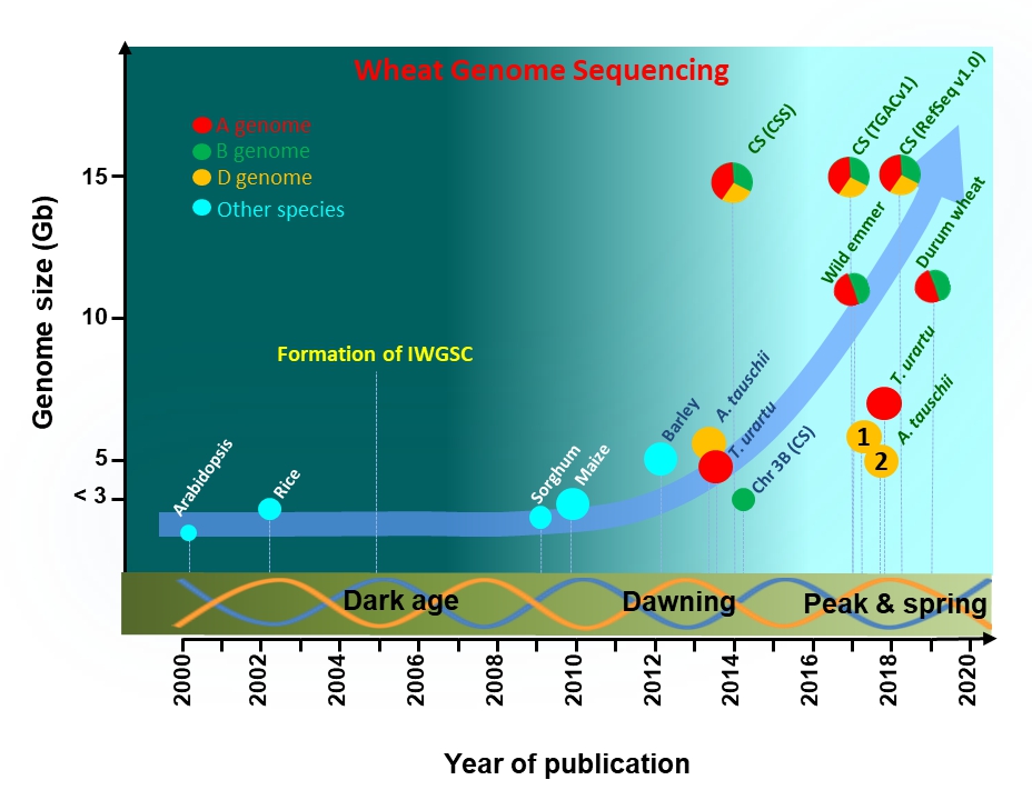 In the year 2018, the world witnessed the finale of the race to sequence the genome of the world’s most widely grown crop, the common wheat. Wheat has been known to bear a notoriously large and complicated genome of a polyploidy nature. A decade competition to sequence the wheat genome initiated with a single consortium of multiple countries, taking a conventional strategy similar to that for sequencing Arabidopsis and rice, became ferocious over time as both sequencing technologies and genome assembling methodologies advanced. At different stages, multiple versions of genome sequences of the same variety ( e.g. , Chinese Spring) were produced by several groups with their special strategies. Finally, 16 years after the rice genome was finished and 9 years after that of maize, the wheat research community now possesses its own reference genome. Armed with these genomics tools, wheat will reestablish itself as a model for polyploid plants in studying the mechanisms of polyploidy evolution, domestication, genetic and epigenetic regulation of homoeolog expression, as well as defining its genetic diversity and breeding on the genome level. The enhanced resolution of the wheat genome should also help accelerate development of wheat cultivars that are more tolerant to biotic and/or abiotic stresses with better quality and higher yield.