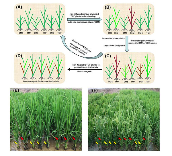 Rice is a crop feeding half of the world population. With the continuous raise of yield potential via genetic improvement, rice breeding has entered an era where multiple genes conferring complex traits must be efficiently manipulated to increase rice yield further. Recurrent selection is a sound strategy for manipulating multiple genes and it has been successfully performed in allogamous crops. However, the difficulties in emasculation and hand pollination had obstructed efficient use of recurrent selection in autogamous rice. Here, we report development of the dwarf male-sterile rice that can facilitate recurrent selection in rice breeding. We adopted RNAi technology to synergistically regulate rice plant height and male fertility to create the dwarf male-sterile rice. The RNAi construct pTCK-EGGE, targeting the OsGA20ox2 and OsEAT1 genes, was constructed and used to transform rice via Agrobacterium-mediated transformation. The transgenic T0 plants showing largely reduced plant height and complete male-sterile phenotypes were designated as the dwarf male-sterile plants. Progenies of the dwarf male-sterile plants were obtained by pollinating them with pollens from the wild type. In the T1 and T2 populations, half of the plants were still dwarf male-sterile; the other half displayed normal plant height and male fertility which were designated as tall and male-fertile plants. The tall and male-fertile plants are transgene-free and can be self-pollinated to generate new varieties. Since emasculation and hand pollination for dwarf male-sterile rice plants is no longer needed, the dwarf male-sterile rice can be used to perform recurrent selection in rice. A dwarf male-sterile rice-based recurrent selection model has been proposed.