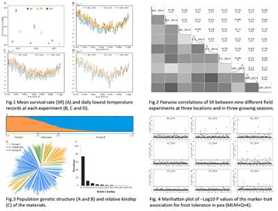 Frost stress is one of the major abiotic stresses causing seedling death and yield reduction in winter pea. To improve the frost tolerance of pea, field evaluation of frost tolerance was conducted on 672 diverse pea accessions at three locations in Northern China in three growing seasons from 2013 to 2016 and marker-trait association analysis of frost tolerance were performed with 267 informative SSR markers in this study. Sixteen accessions were identified as the most winter-hardy for their ability to survive in all nine field experiments with a mean survival rate of 0.57, ranging from 0.41 to 0.75. Population structure analysis revealed a structured population of two sub-populations plus some admixtures in the 672 accessions. Association analysis detected seven markers that repeatedly had associations with frost tolerance in at least two different environments with two different statistical models. One of the markers is the functional marker EST1109 on LG VI which was predicted to co-localize with a gene involved in the metabolism of glycoproteins in response to chilling stress and may provide a novel mechanism of frost tolerance in pea. These winter-hardy germplasms and frost tolerance associated markers will play a vital role in marker-assisted breeding for winter-hardy pea cultivar.