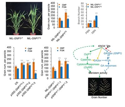 Cytokinins and gibberellins (GAs) play antagonistic roles in regulating reproductive meristem activity. Cytokinins have positive effects on meristem activity and maintenance. During inflorescence meristem development, cytokinin biosynthesis is activated via a KNOXmediated pathway. Increased cytokinin activity leads to higher grain number, whereas Gas negatively affect meristem activity. The GA biosynthesis genes GA20oxs are negatively regulated by KNOX proteins. KNOX proteins function as modulators, balancing cytokinin and GA activity in the meristem. However, little is known about the crosstalk among cytokinin and GA regulators together with KNOX proteins and how KNOX-mediated dynamic balancing of hormonal activity functions. Through map-based cloning of QTLs, we cloned a GA biosynthesis gene, Grain Number per Panicle1 (GNP1), which encodes rice GA20ox1. The grain number and yield of NIL-GNP1TQ were significantly higher than those of isogenic control (Lemont). Sequence variations in its promoter region increased the levels of GNP1 transcripts, which were enriched in the apical regions of inflorescence meristems in NILGNP1 TQ. We propose that cytokinin activity increased due to a KNOX-mediated transcriptional feedback loop resulting from the higher GNP1 transcript levels, in turn leading to increased expression of the GA catabolism genes GA2oxs and reduced GA1 and GA3 accumulation. This rebalancing process increased cytokinin activity, thereby increasing grain number and grain yield in rice. These findings uncover important, novel roles of Gas in rice florescence meristem development and provide new insights into the crosstalk between cytokinin and GA underlying development process.