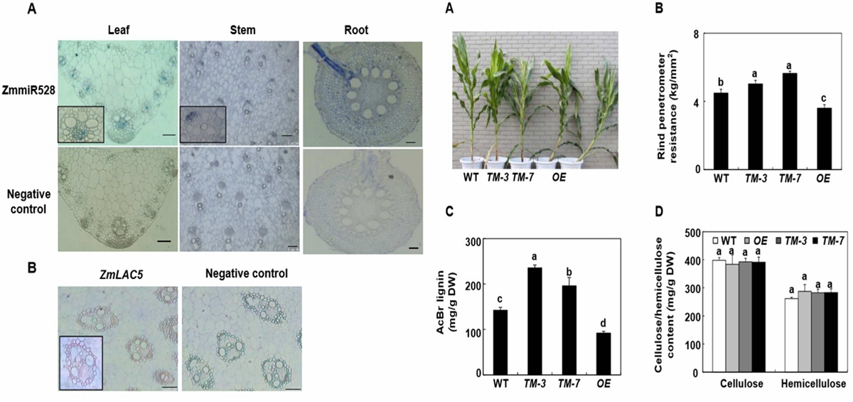 Lodging under N-luxury conditions substantially reduces crop yield and seed quality. However, the molecular mechanisms of plant lodging resistance remain largely unclear, especially in maize. We report here that the expression of ZmmiR528, a monocot-specific miRNA, is induced by nitrogen (N) luxury but reduced by N deficiency. Thioacidolysis and acetyl bromide (AcBr) analysis showed that N luxury significantly reduced the generation of H, G, and S monomers and the total lignin content of maize shoots. We further demonstrated that ZmLACCASE3 (ZmLAC3) and ZmLACCASE5 (ZmLAC5) are the targets of ZmmiR528. In situ hybridization showed that ZmmiR528 is mainly expressed in the vascular tissues in maize. Knock-down ZmmiR528 significantly increased the lignin content and rind penetrometer resistance in maize stems. In contrast, transgenic maize overexpressing ZmmiR528 had reduced lignin content and rind penetrometer resistance and was prone to lodging under N-luxury conditions. Overexpression of ZmLAC3 increased maize lignin contents and rind penetrometer. RNA-seq analysis indicated that ZmPAL7 and ZmPAL8 are upregulated in ZmmiR528 knock-down transgenic maize. Under N-luxury conditions, the expression levels of ZmPALs were much higher in ZmmiR528 knock-down transgenic maize than in WT and ZmmiR528 OE transgenic maize. The results indicate that, by regulating the expression of ZmLAC3 and ZmLAC5, ZmmiR528 affects maize lodging resistance under N-luxury conditions.